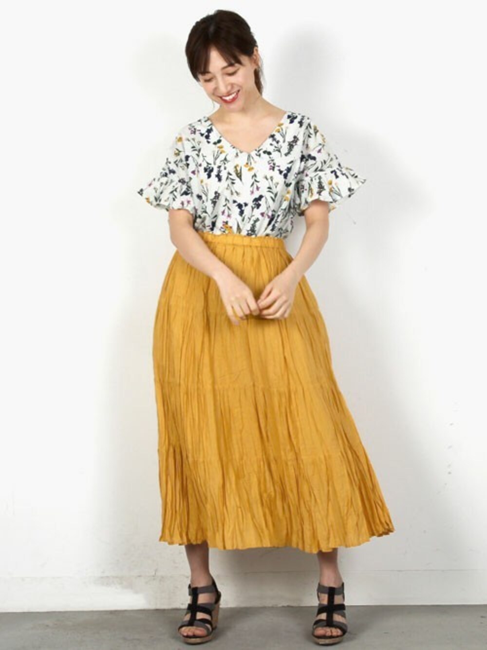 大人の花柄を全面にプリントしたブラウス。 可愛らしい小花柄をシックに散りばめました。コーデの主役になるパッと華やかなカラースカートは春夏のマストアイテム! くしゅっとしたシワ感が雰囲気たっぷりで大人可愛さをプラス◎