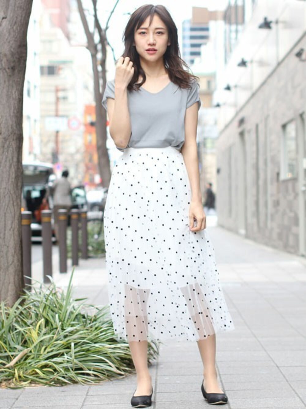 繊細なチュールレースをプリーツ状にし、ドットをプリントした女性らしいスカート。 これ1枚投入するだけで軽やかで春らしい装いが叶います。