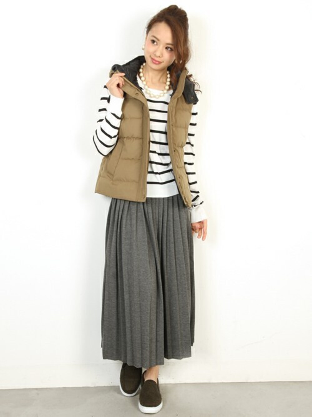 季節の変わり目にヘビロテできる大人気のライトアウター「ダウンベスト」!詰め物にはしっかりダウン入だからちょっと肌寒いお出掛けの日にも大活躍間違いなし♪ ボーダーのトップスとミモレ丈のプリーツスカートを合わせてこなれ感たっぷりの大人カジュアルスタイルです!