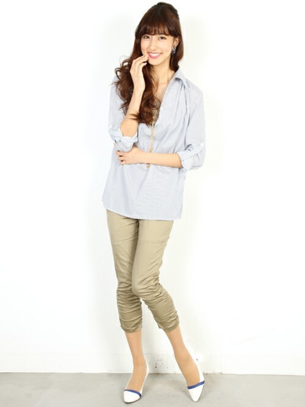 コーディネートを選ばない王道のスキッパーシャツ!ストライプ柄でハンサムにキマります。 お仕事にも、普段のカジュアルスタイルにもしっかりキマって、着心地も抜群。レイヤードアイテムで遊べて、オシャレ見えすること間違いなし♪ 合わせたチノパンはポケット部分にさりげないリボンのディティールが!当店の大人気ボトムスです。