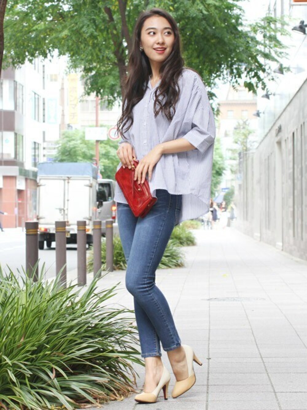 シャツ×デニムのシンプルな大人カジュアルスタイル。ゆったり着られるワイドなシルエットはこなれ感を演出するオシャレ上級者アイテム!鎖骨を綺麗に見せるキーネックや、ヌケ感のある袖丈もポイント。