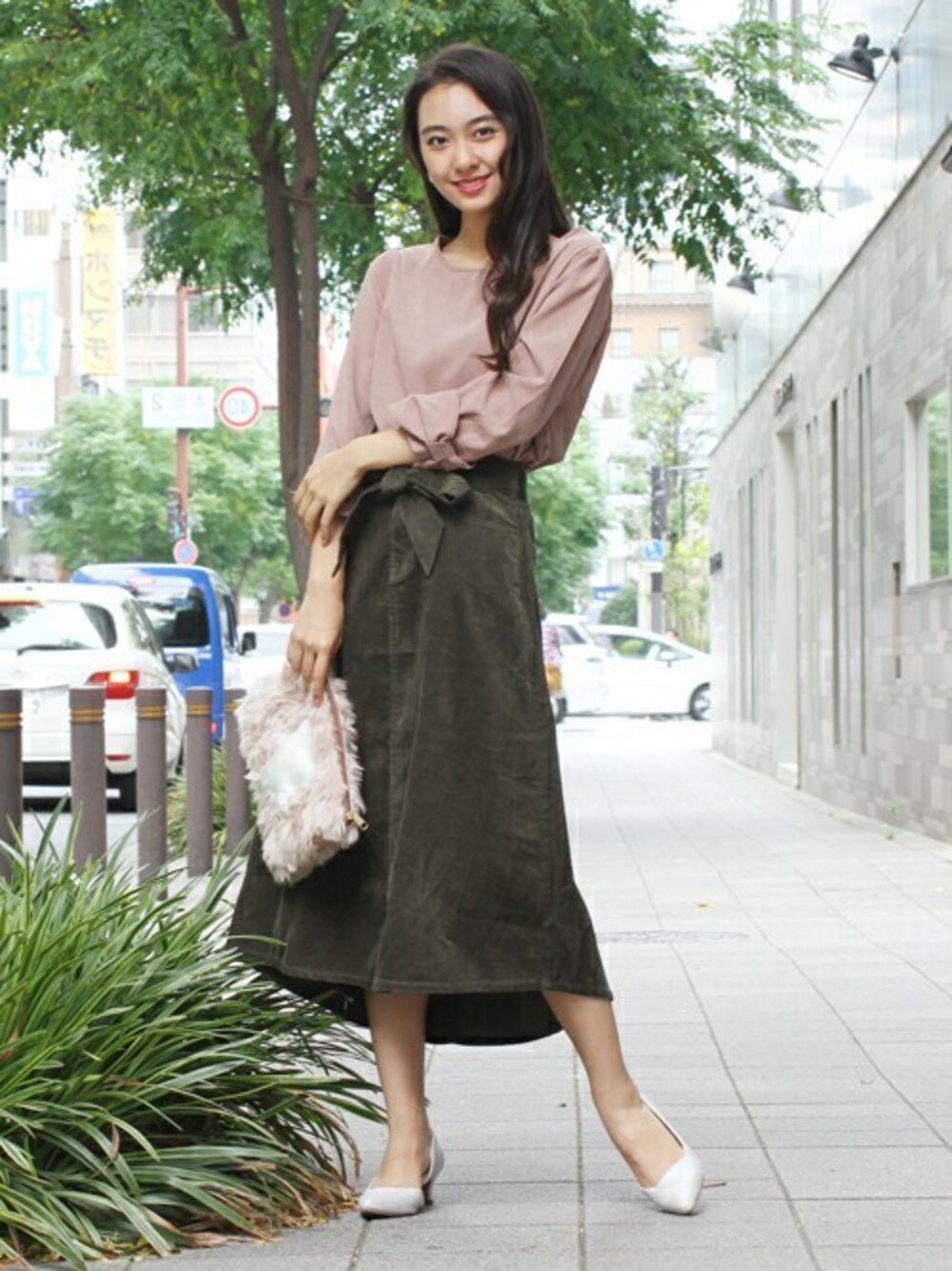 ~FELLINI~ ▶秋らしいダスティピンクとカーキの組み合わせが大人フェミニンなコーディネート✨ ▶袖のリボンがワンポイント👍 ▶コーデュロイのスカートは後ろが少し長くなっているフィッシュテールデザイン🎶 ▶脚長&トレンド感ばっちり😊