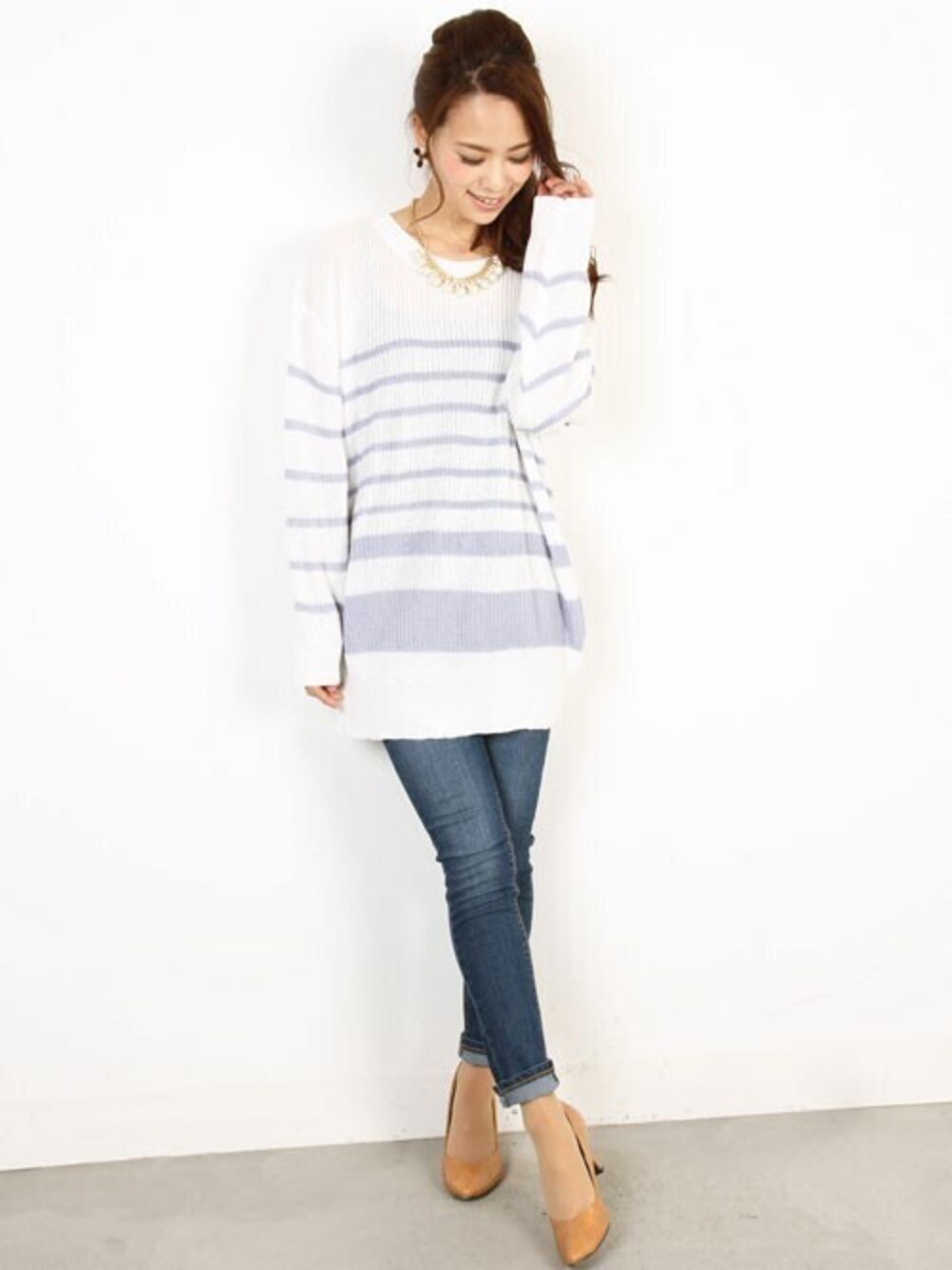イレギュラーなボーダー柄が可愛いニットはざっくり&長めのチュニック丈でラフに着こなして。デニムを合わせるだけでこなれ感も出るので、大人カジュアルにオススメ☆