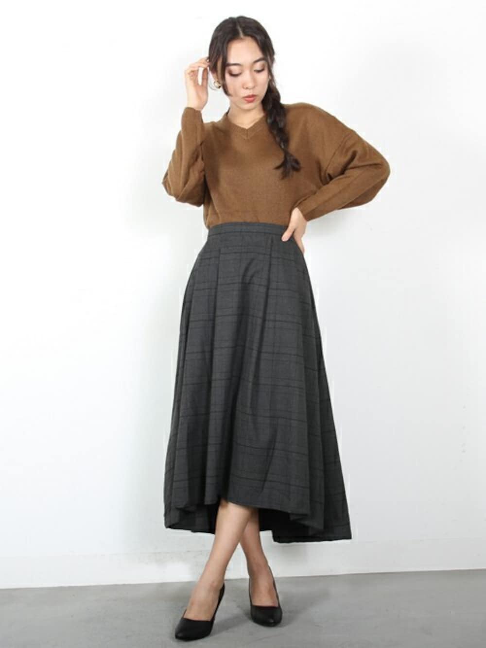 ハイウエストですらっと脚長効果のあるグレンチェック柄のスカート♪マニッシュの印象の強いグレンチェックですが、キャメルのモヘアタッチニットと合わせてちょっぴり甘くコーディネート♪ゆるっとしたドルマンシルエットや、裾の揺れ感が可愛い!