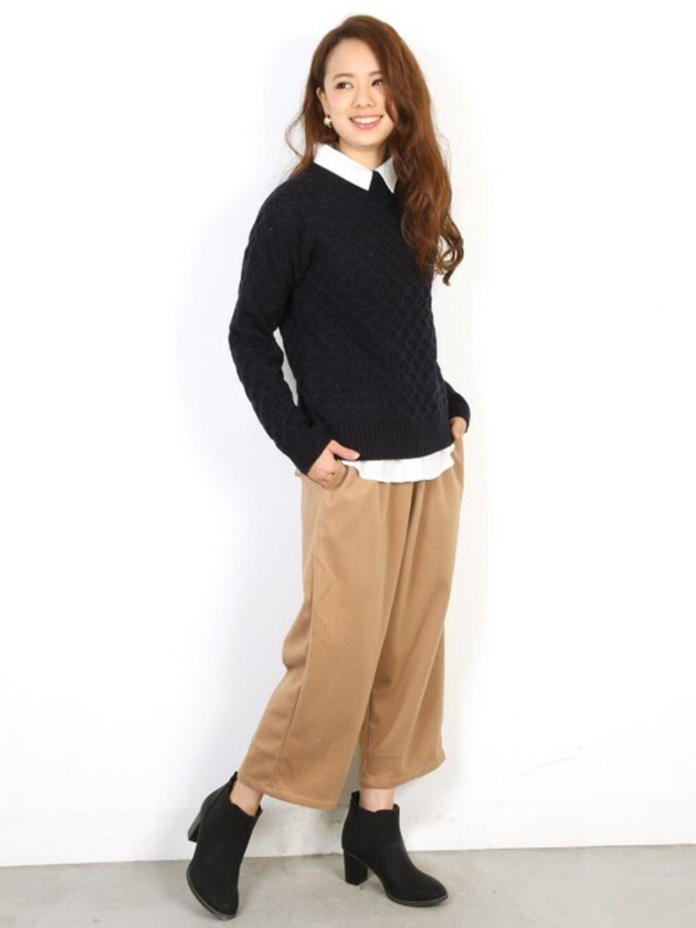 立体感のあるケーブル柄がアクセントのハイネックニット。シャツをレイヤードさせてきちんと感を出しつつガウチョパンツでカジュアルダウンさせたオシャレ上級者コーデ。 ニットは1枚で着てももちろん可愛い!