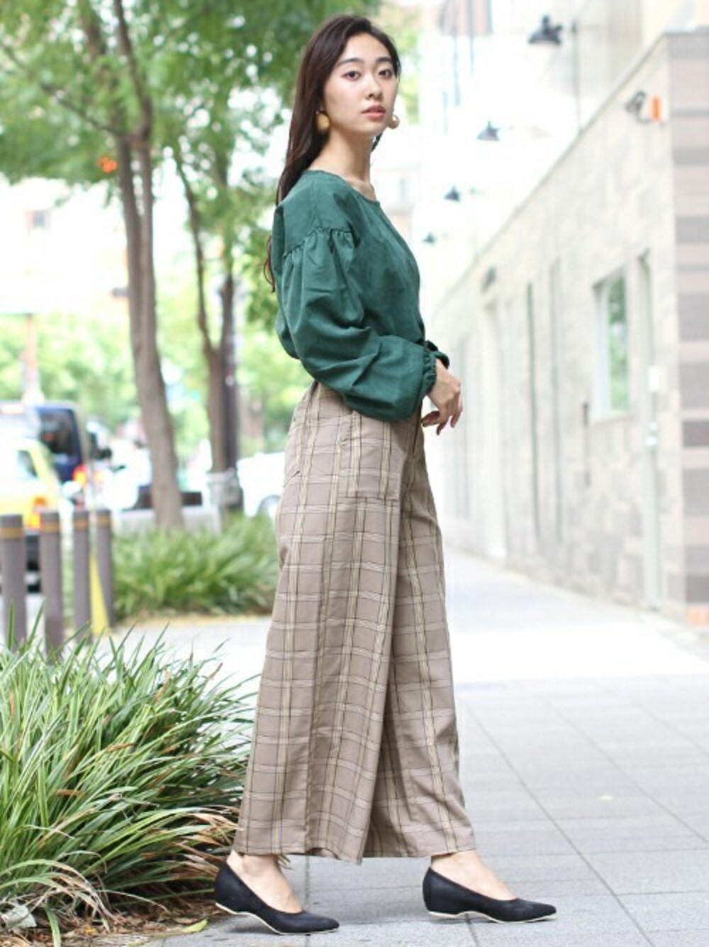 タックでつくるふんわりボリューム袖が今っぽい♪チェック柄のパンツを合わせてこなれ感抜群の秋の大人カジュアル★