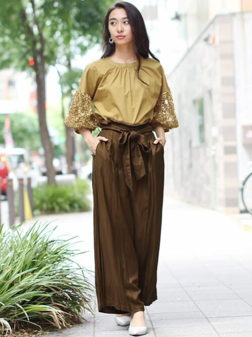 袖に咲いた小さな花びらがフェミニンで着栄え度も抜群なブラウス。サスペンダー付のワイドパンツはレーヨンツイル素材が高見えポイント!