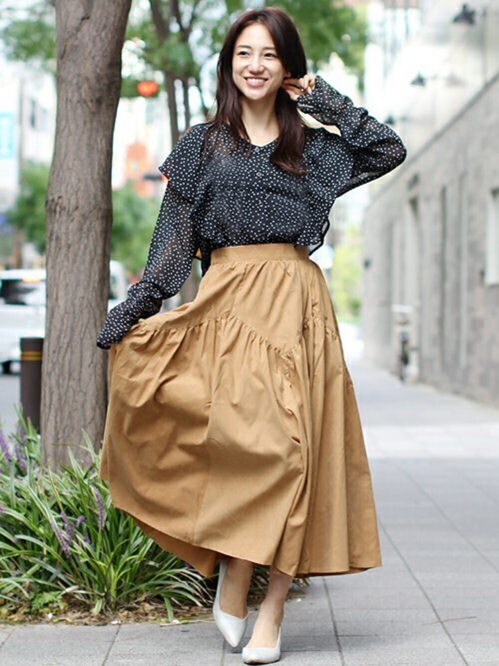 ティアードデザインのボリューミーさが可愛いロングスカート! フリル&ドットのシフォンブラウスでぐっと女性らしくデートにもオススメのコーディネートです。