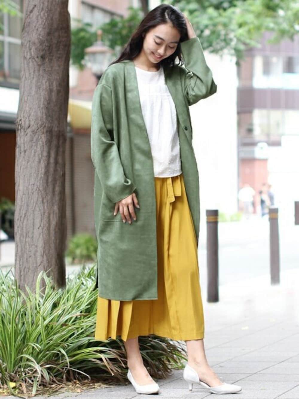 秋らしいフェイクスエードのコクーンコート。ライトな着心地なのでカーディガン感覚でサッと羽織れるところも魅力。マスタードのスカートとの組み合わせで何ともオシャレ!