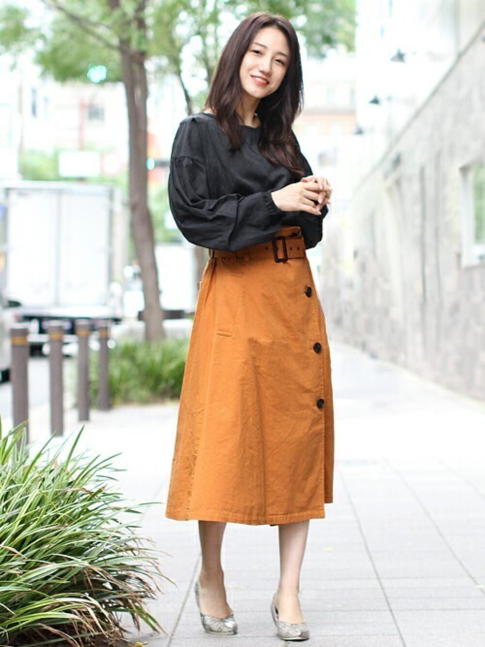 ブラック×オレンジの秋らしい配色でつくったスタイリング。トレンチデザインの前ボタンスカートで一気に今っぽい旬な装いに♪