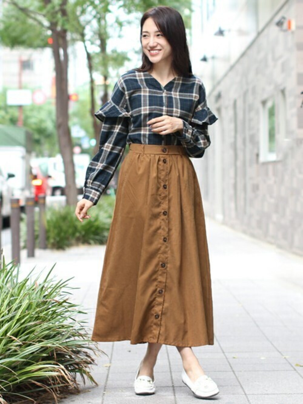 うっすら起毛素材と、あたたかみのあるチェック柄がシーズンムード高まる1枚。前ボタンがトレンドライクなピーチ素材のスカートで愛らしい大人カジュアルスタイルへ♪