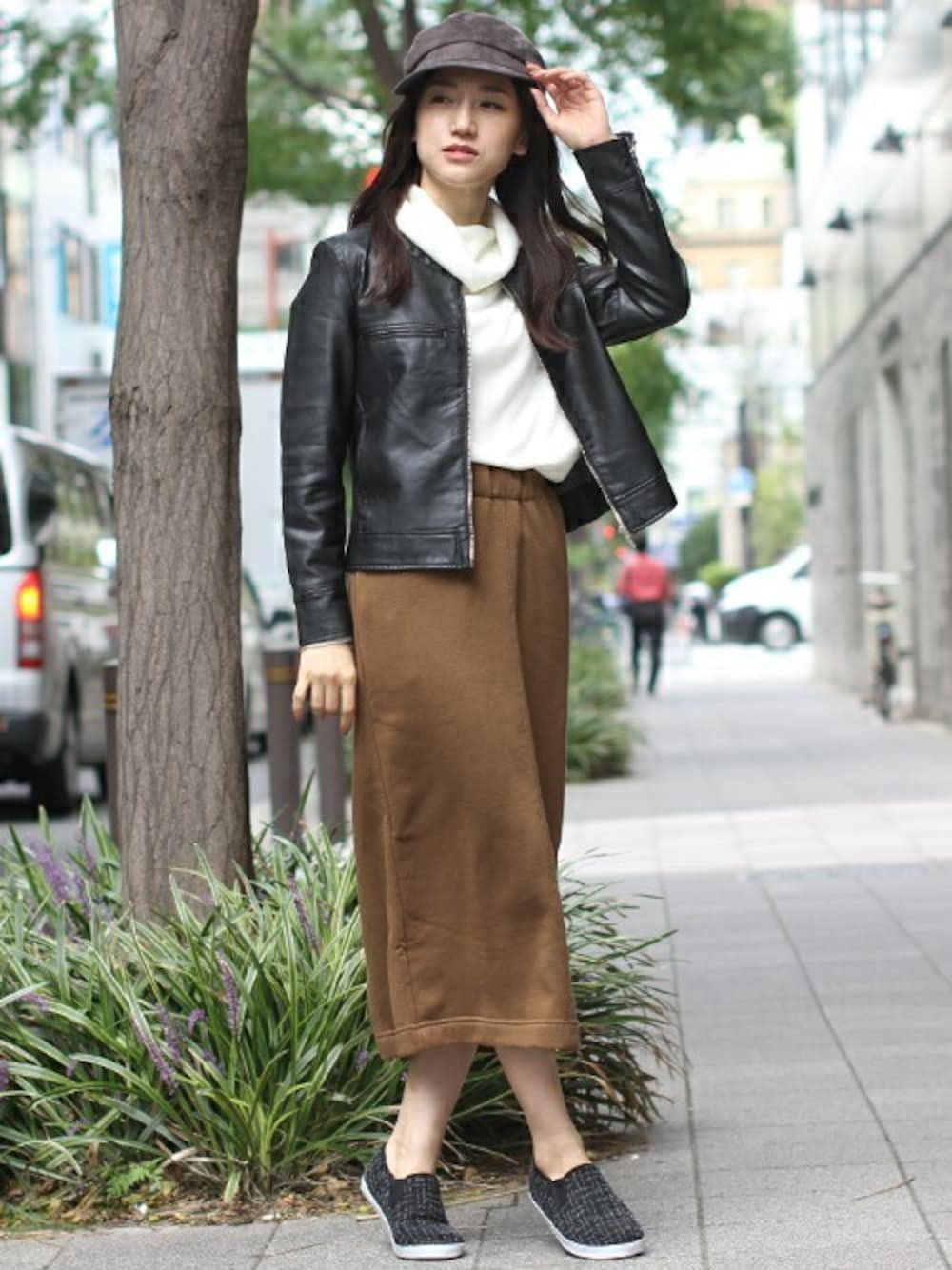 ノーカラーのライダースは上品でレディな印象になるので、スニーカーや帽子でうまくカジュアルダウンさせる着こなしがオススメ♪合わせたタイトスカートはふわふわの裏起毛があったかくこの冬必需品な1枚!