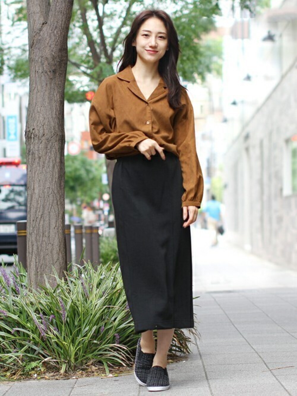 顔周りスッキリのオープンカラーシャツ。シンプルなタイトスカート&スリッポンと合わせたほどよくラフな大人カジュアル。 合わせたスカートは裏起毛でふわふわのあたたかさ♪