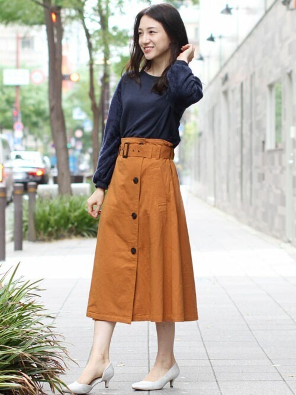 袖のモコモコファーが愛らしいニットソー。 オレンジのトレンチスカートでカジュアルでトレンドライクなスタイリング。