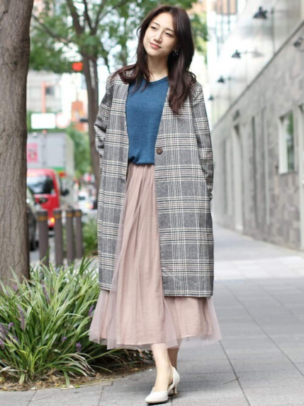 マニッシュなチェック柄コートをレディなスカートスタイルで合わせた大人のコーデ。 ブルーの差し色が爽やか♪