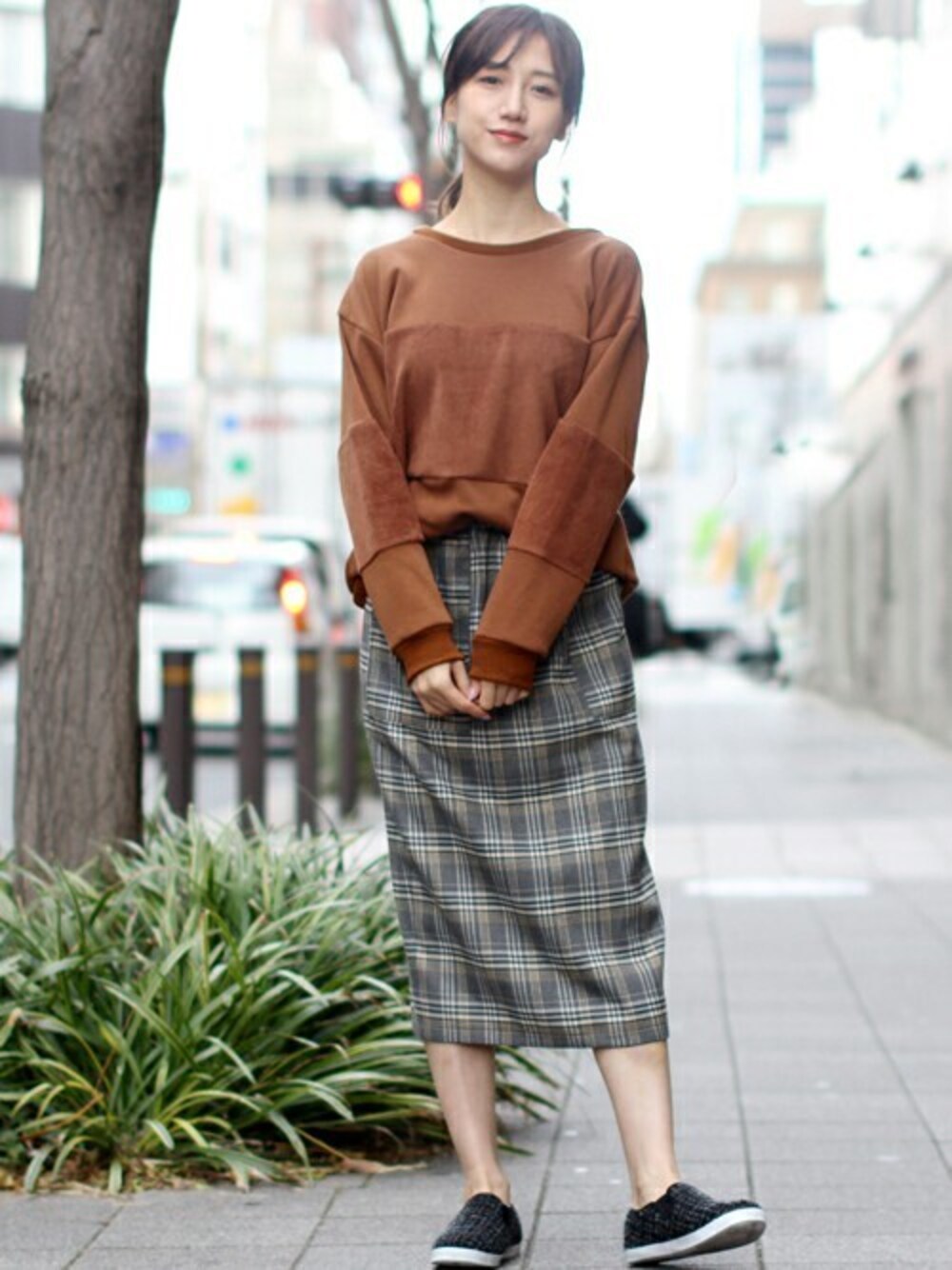 身頃と袖のシャギー切り替えが目を惹くプルオーバー。 スカートはチェック×無地のリバーシブルで活躍度大! 大人可愛いカジュアルスタイルです♪