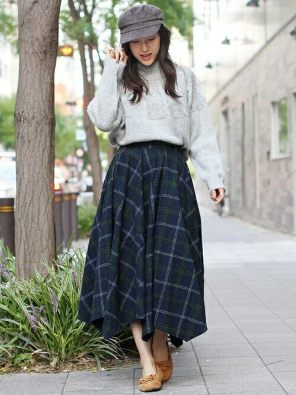 胸元の等間隔のケーブル編みとゆったりシルエットが愛らしく女性らしさも抜群のシープタッチニット。 チェック柄のスカートは、ボリューミーな広がりがポイント!