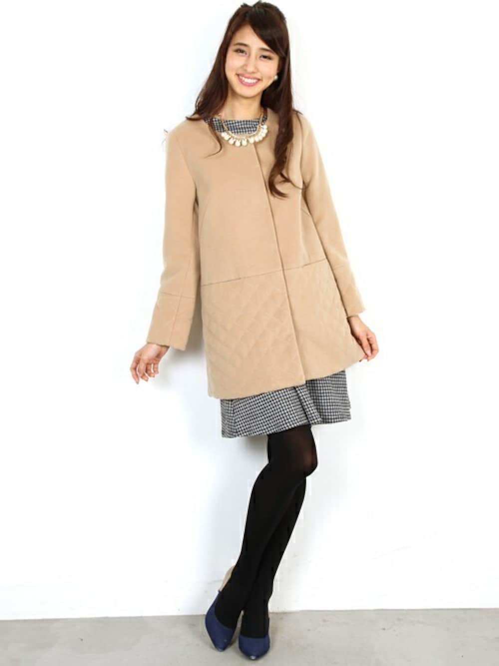 スッキリ見えるAラインシルエットでボタンを開けても閉めても映えるシルエットにこだわりました。 袖口と裾をキルティングで切替えたデザインもオシャレ!このアウターを羽織れば上品でレディなスタイリングに早変わり♪ 品格溢れるノーカラーコートは、大人の女性のテッパンアウターです♪