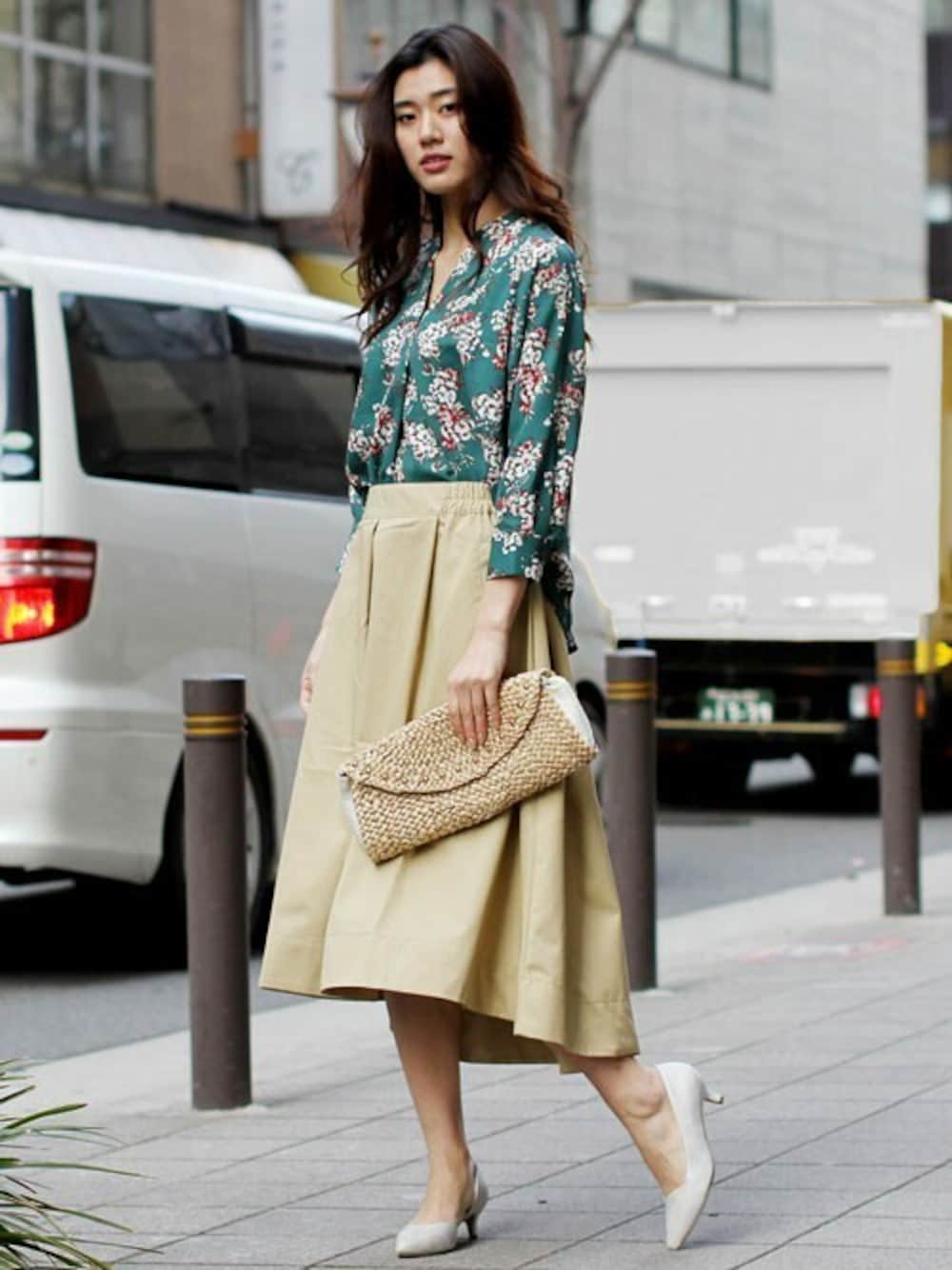 トレンドライクな花柄のブラウスは1枚でしっかり着栄える大人レディなアイテム。チノ素材の万能スカートと合わせて最旬の大人カジュアルに!テールカットの裾とワイドタックがスカートの美シルエットをキープします♪