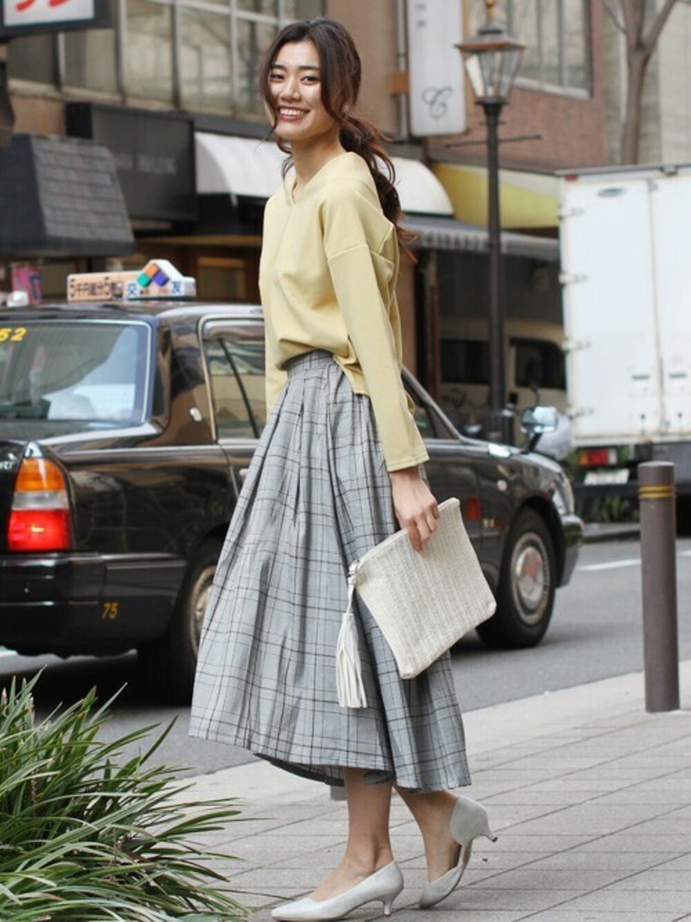 凹凸のある素材が上品さを演出するリップル素材のプルオーバー。前も後ろもVに開いたネックラインは女度あがるポイント。グレンチェッくのミモレ丈スカートを合わせて最旬スタイルの完成です。