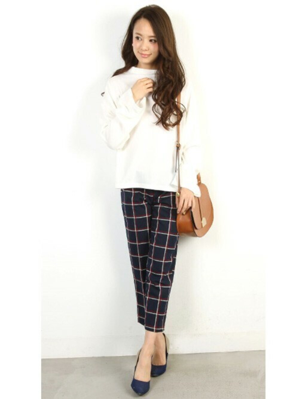 チェック柄のテーパードパンツはセンタープレス入りできちんと感があるのでオフィスにもOK◎ ボトルネックが旬なプルオーバーを合わせてシンプルな大人スタイル♪