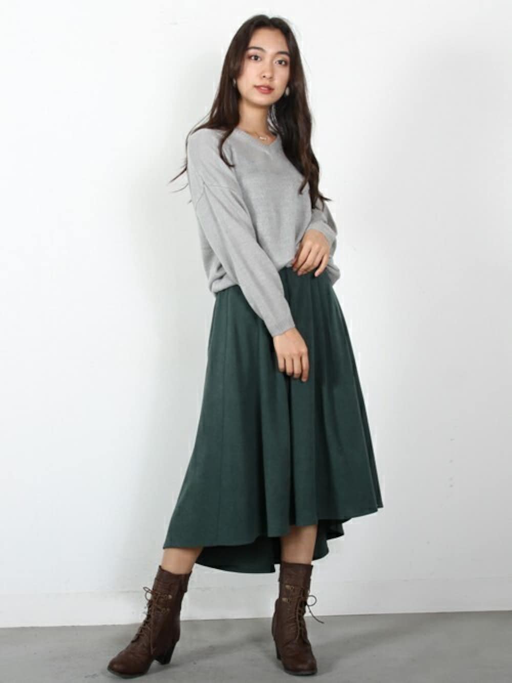 ふわっと柔らかいタッチのモヘアニットに女性らしいフレアなスカートを合わせた大人かわいい上品スタイル。グレー×ダークグリーンの組み合わせが今季は気になる!