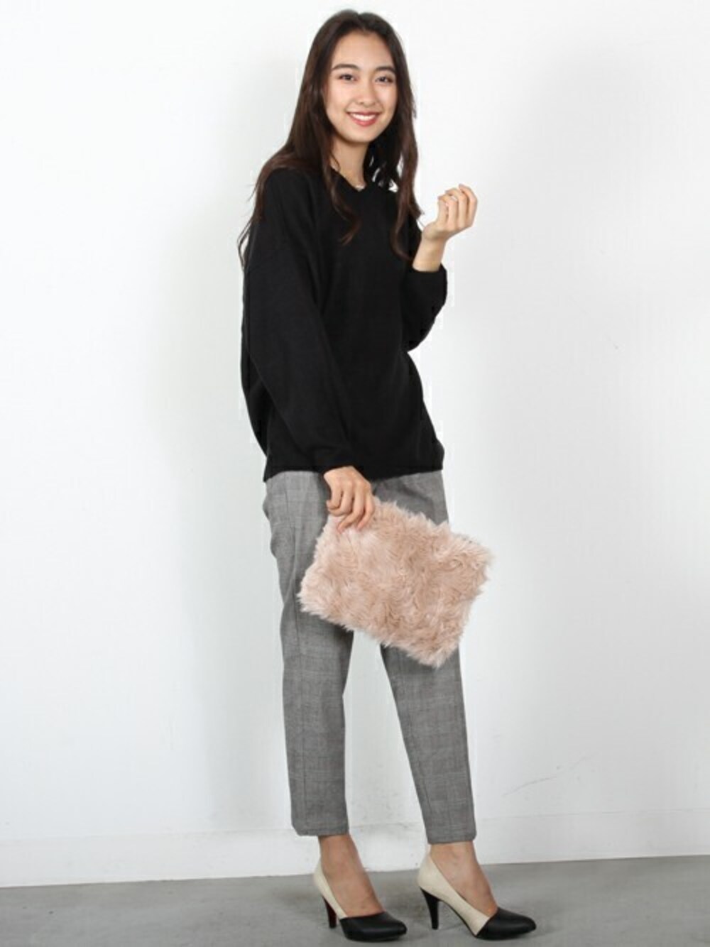 柔らかい素材が特徴のモヘアニット。ゆるっとしたラフなシルエットに、きちんと感のあるテーパードパンツを合わせたバランスの良い大人カジュアル◎ グレンチェック柄が旬なパンツは大人っぽくオフィスにも使えます。