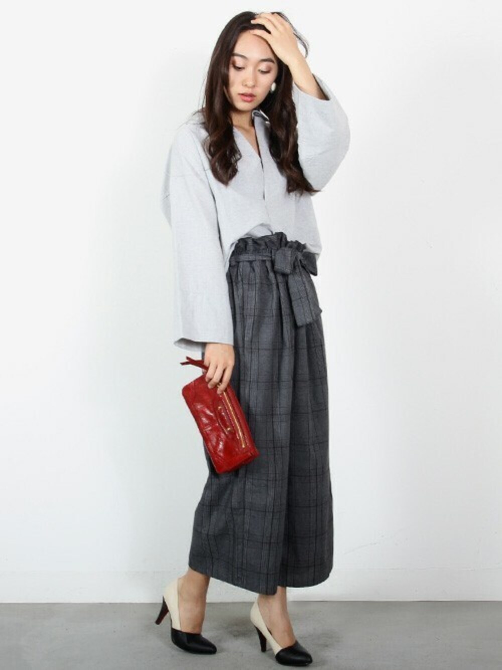 深く開いた胸元のVラインが印象的なスキッパーシャツは、ほっこり温かみのあるフランネル素材。グレンチェッく柄のワイドパンツと合わせてシックでクールな大人スタイル。