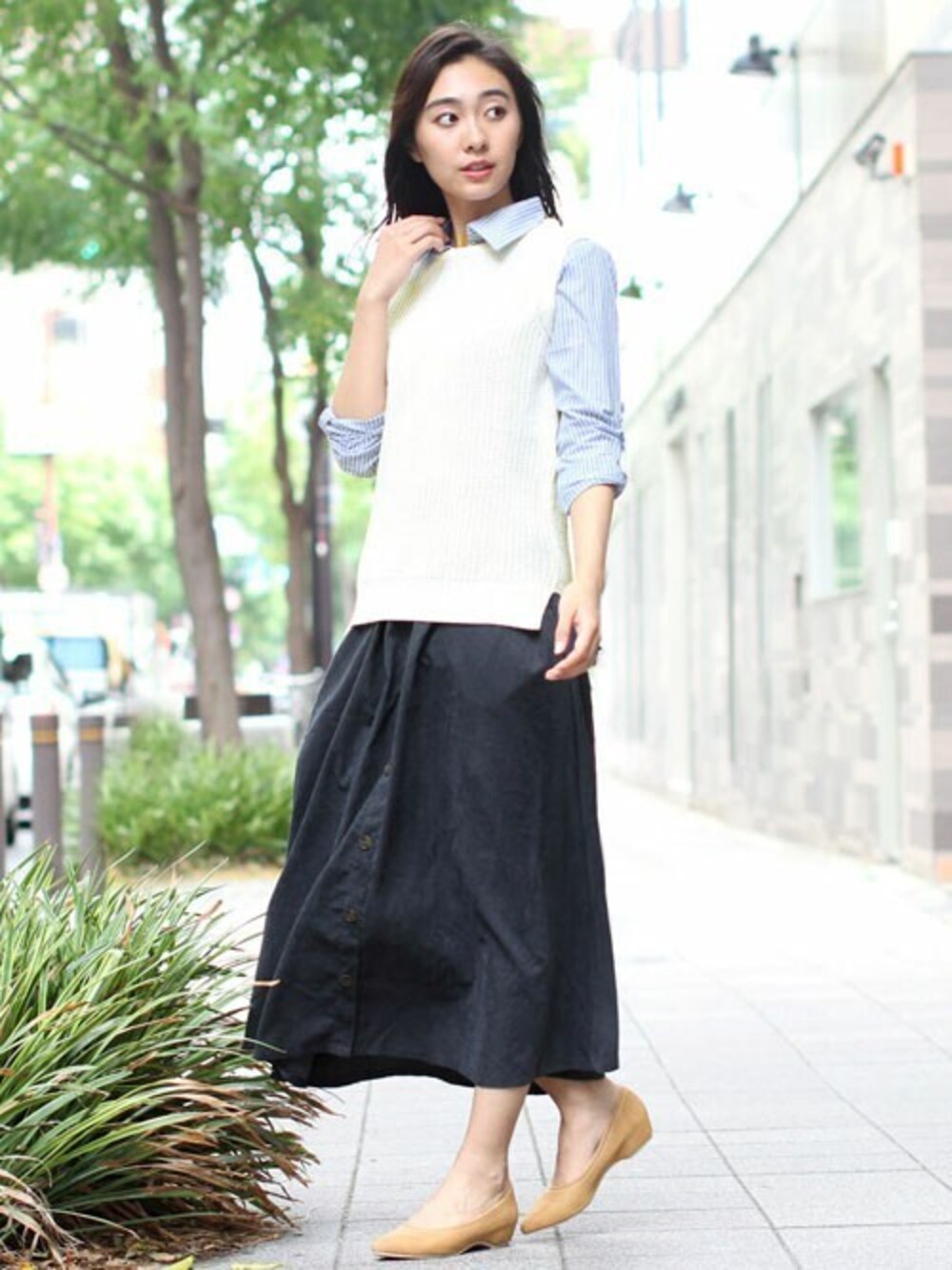 ニットベストとシャツをレイヤードさせたシンプルだけどオシャレなスタイリング。爽やかなホワイトのニットベストには爽やかなライトブルーのシャツが相性抜群です♪