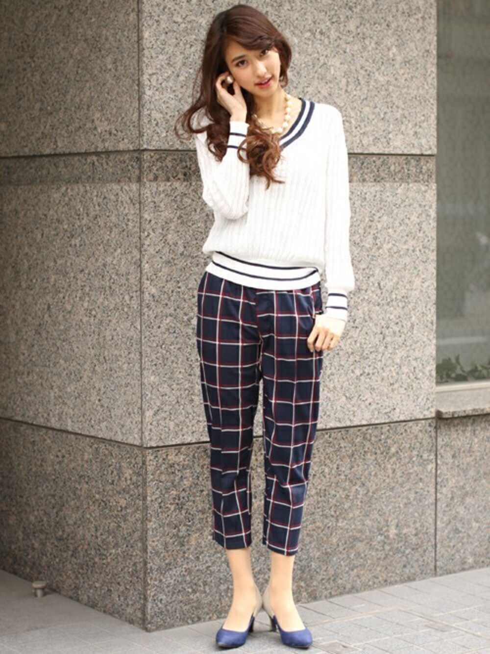 ラインを効かせてメリハリのあるスタイリングが生まれるチルデンニット。チェック柄のアンクルパンツを合わせればたちまちオシャレ度急上昇!