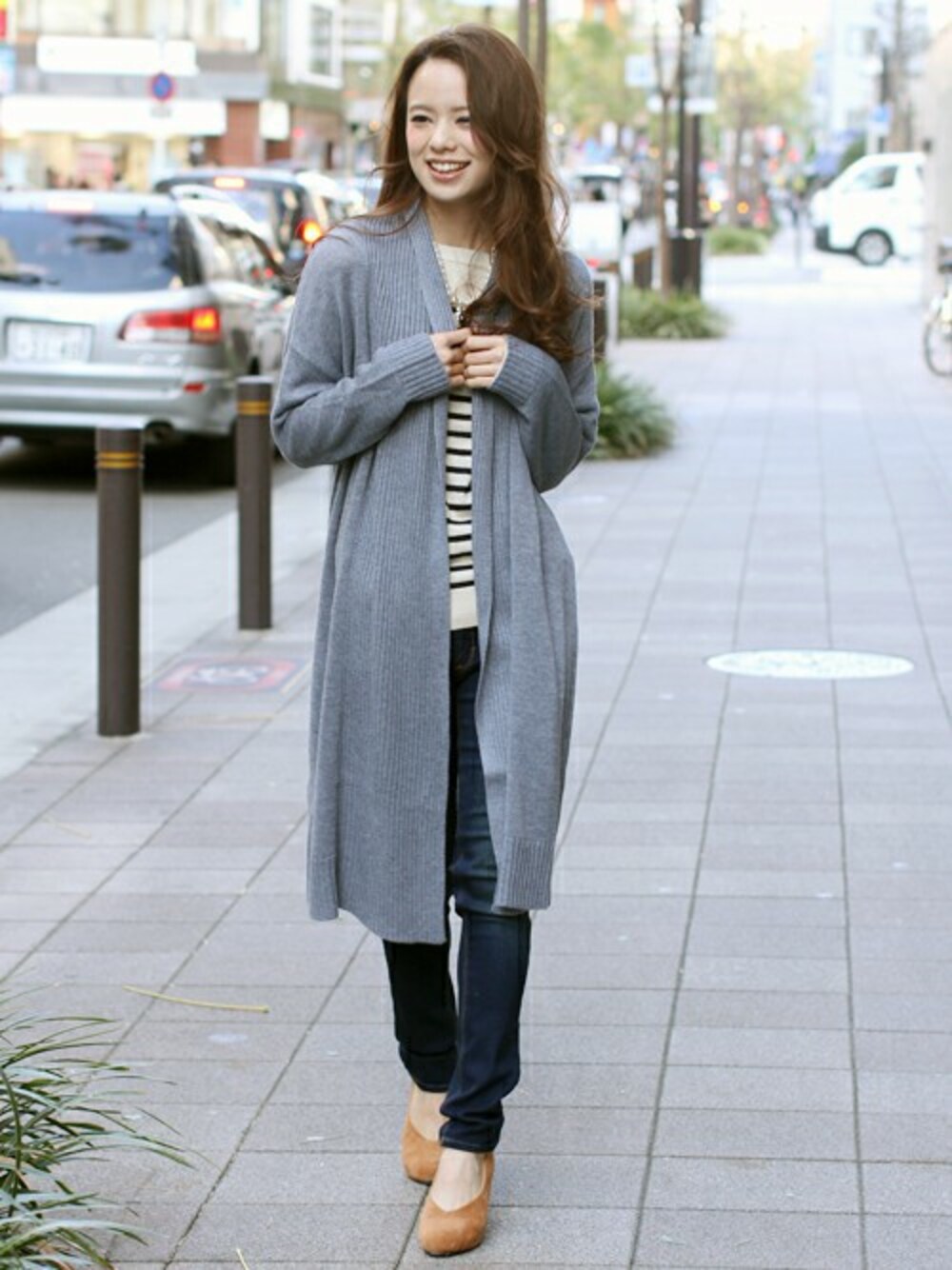 ボーダーニットにニットのロングカーデを羽織って愛され秋コーデ♡ カーディガンはゆるっとこなれ感の出るリブ編みです。 デニムは裏起毛だから寒い冬でもあったか!もちろんストレッチ抜群で美脚をキープ♪ Iライン効果でほっそりスタイルアップが狙える着こなしです。