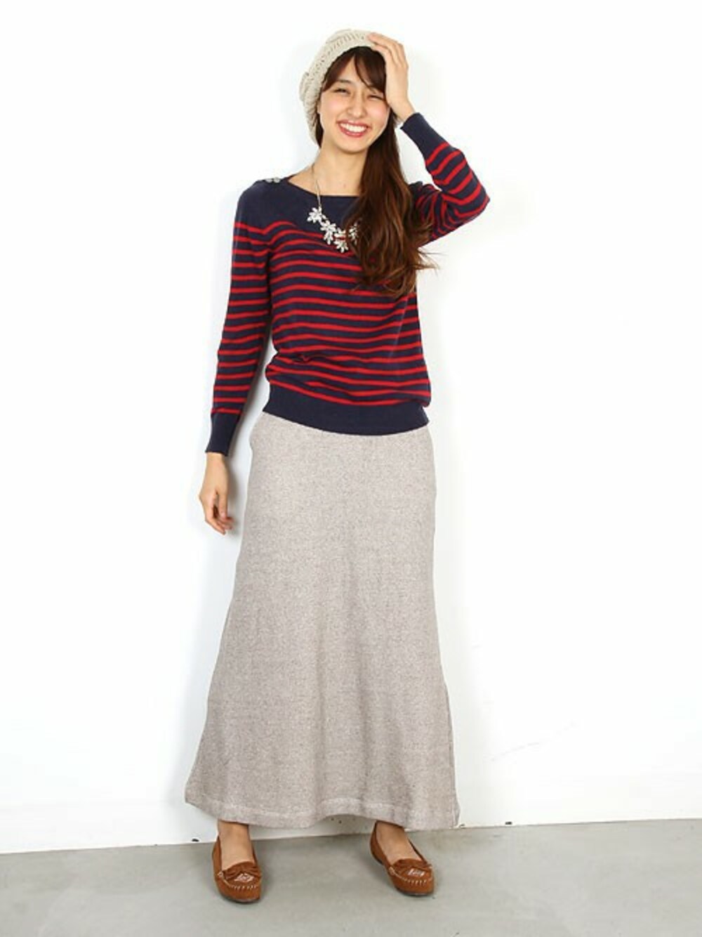 ボーダーニット×マキシスカートでつくる大人のゆるカジコーデ★ 刺繍入りモカシンが足元でセンスを発揮します。スカートは裏毛のスウェット生地で毎日でも履きたくなる着心地の良さを実現。 ボーダーニットはアンゴラ混でしっかりあたたかい♡