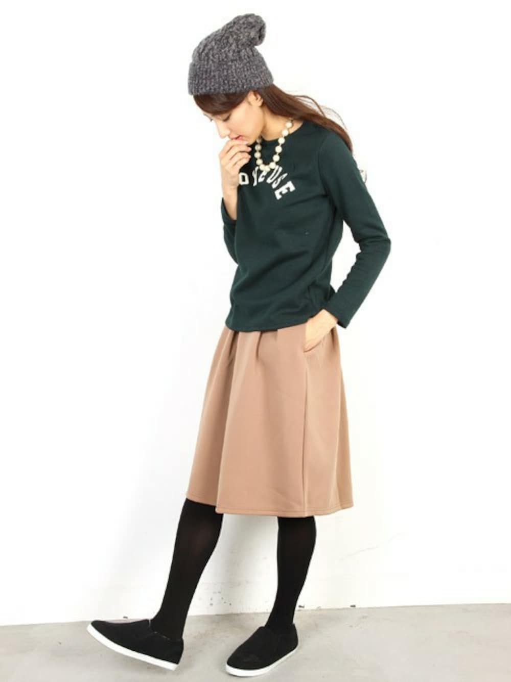 プチハイネックが首元をきれいに見せてくれるロゴプリントプルオーバー。スウェットよりきれいめに仕上がる生地で大人のカジュアルスタイルにおススメ! グリーン×ベージュは季節感たっぷりのこなれスタイル♪型崩れせずキレイなシルエットをキープしてくれるダイバー素材のスカートもオススメ!