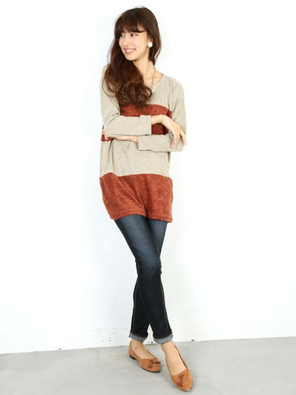 トレンドのテラコッタオレンジを取り入れた、カジュアルでナチュラルな可愛さが引き立つコーデ。 異素材をバイカラーで切り替えたチュニックはパンツとの相性抜群の着丈♪ パイルニットの肌触りがクセになり、デイリー使いにピッタリです。