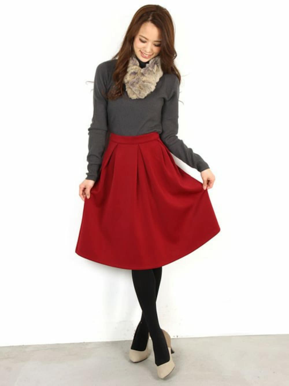 赤いスカートはいつだって女の子を主役にしてくれる!♪ シンプルなのに、グレー×レッド×ファーアイテムの組み合わせがとびきり今っぽいスタイリング。 ダイバー素材のフレアスカートは型崩れせずに、美シルエットをキープしてくれる優秀アイテム。 デートにも、女子会にも、女子力あがるコーディネートです!