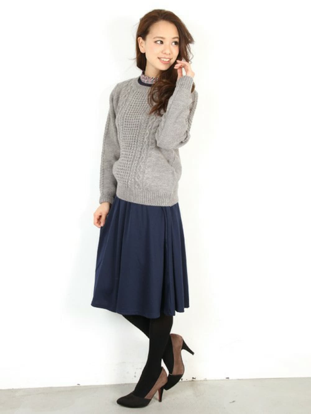 インナーに着たアイテムは、レイヤードスタイルに合わせるとオシャレ度が増す優秀な1枚。 詰まり気味のクルーネックが今っぽくて旬!立体的なケーブル編みが可愛いニットは、コンパクトなサイズ感で ワイドパンツやフレアスカートと相性◎グレー×ネイビーで好感度バッチリに、オトナ可愛く仕上げました。