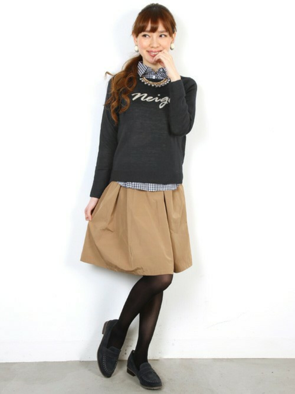 大人女子テッパンアイテムのロゴニットは、とことんカジュアルにも、程良く綺麗めにも、いろいろと着回せる実はとっても優れたアイテム! こちらのロゴニットは、カジュアル過ぎないロゴで大人っぽく着れるデザインです♪ ギンガムチェックのシャツをレイヤードしてちょっぴりカジュアルダウン♪ ボトムはフレアスカートでしっかりレディな雰囲気もプラス♪ デートにも女子会にもショッピングにも!これぞ「大人かわいい」のモテスタイリングです★