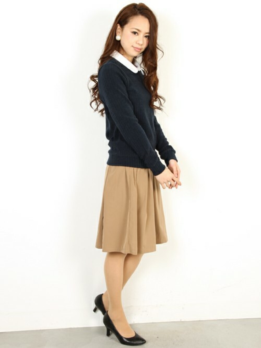 ニット×フレアスカートの大人可愛いレディコーデ♪ こちらのニットは付け襟デザインになっているから、コーデの様にシャツレイヤード風に着たり、襟を外してシンプルなケーブルニットとして着たり、着回し力抜群の優秀な1枚です。 フレアスカートは、立体感のあるシルエットをキープしてくれる形状記憶タイプ☆ 生地のハリと微光沢で上品な華やかさを演出します!