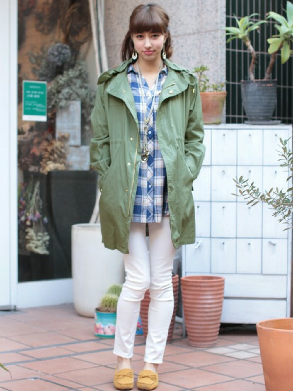クール派もモード派も春先に取り入れたいモッズコートスタイル! こちらのアウターは取り外し可能なライナー付き!春はもちろん秋口だって着回しOK♪ フードも取り外せるから、気分によって使い分けて◎ チェックのネルシャツを合わせるとぐっとこなれ感が出て大人カジュアルなスタイリングに。 抜け感のある白デニムで全体的に爽やかで大人かわいく!