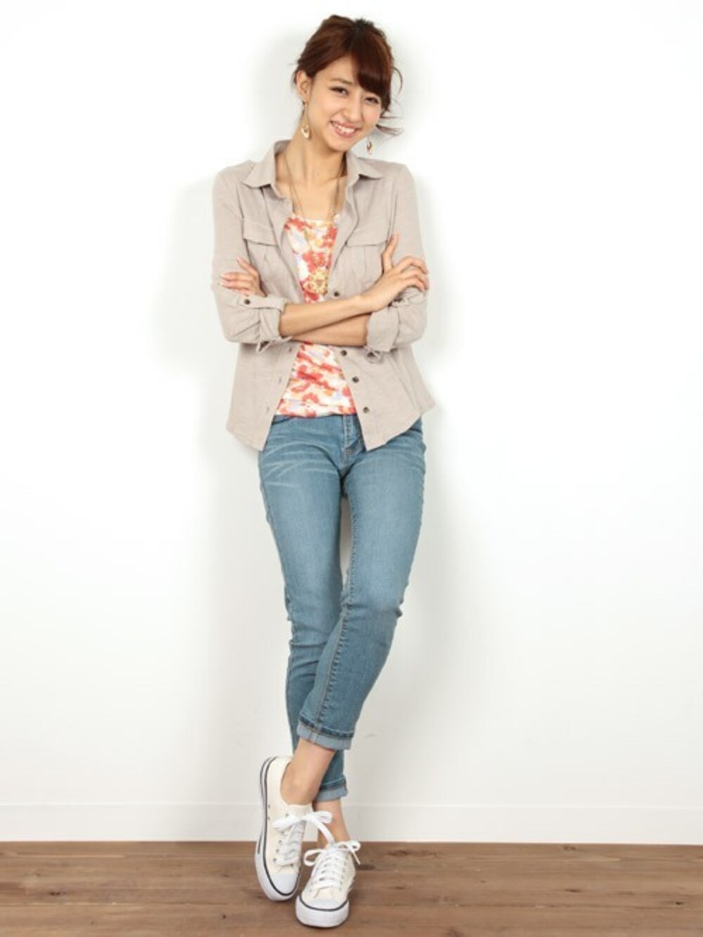 春らしい花柄のタンクトップは、レイヤードアイテムとしても大活躍! さらりと羽織ったシャツは綿100%のカジュアルな素材感に、シンプルなデザインだから、シャツスタイルにも、このように羽織りとしても使えます◎