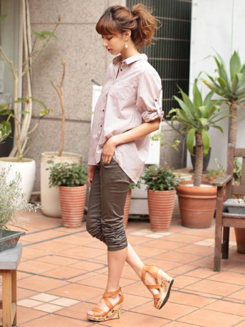 これからの季節に嬉しいUVカット機能付きシャツ!ロールアップでこなれた雰囲気に。 綿混のさらっとした着心地なのでロングシーズン重宝。シンプルなアイテムこそ着心地にこだわりたい! 合わせたカーキのチノパンはポケット部分がさり気ないリボンデザインになっている大人フェミニンなボトム! 裾のシャーリングやクロップド丈で、穿きやすさと美脚をとことん追求しました!
