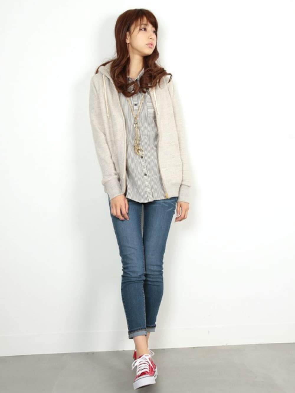 ストライプのシャツにパーカーを羽織ったちょっぴりマニッシュなカジュアルコーデ♪ こちらのシャツはUVカット機能付きだからレジャーや旅行にもオススメ!羽織としても使えますが今回はトップスとして★ こなれたカジュアルスタイルです!