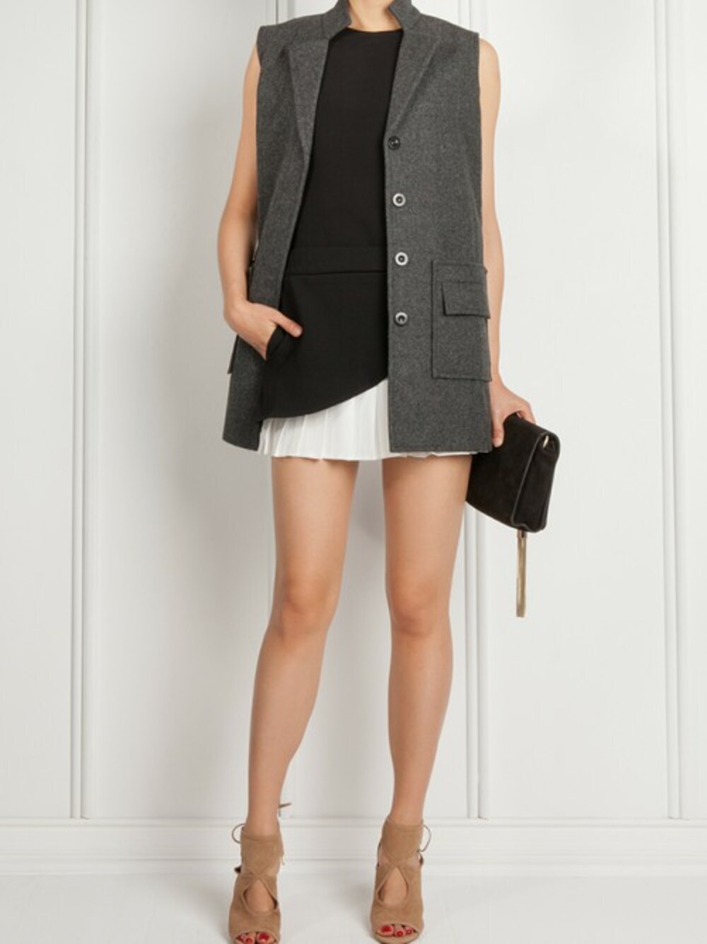Everyone could use a little structure in their life. This 4 button gray vest with standup collar is great layered over a dress or worn over a blouse and pants combo. Constructed of solid material featuring functional front pockets, you'll feel like you could take on whatever task is thrown at you. 70% Wool, 30% Polyester Dry Clean/ Hand Wash Notes: A structural piece with standup collar Solid Material Model is 173cm/5'8'' and is wearing size S/M