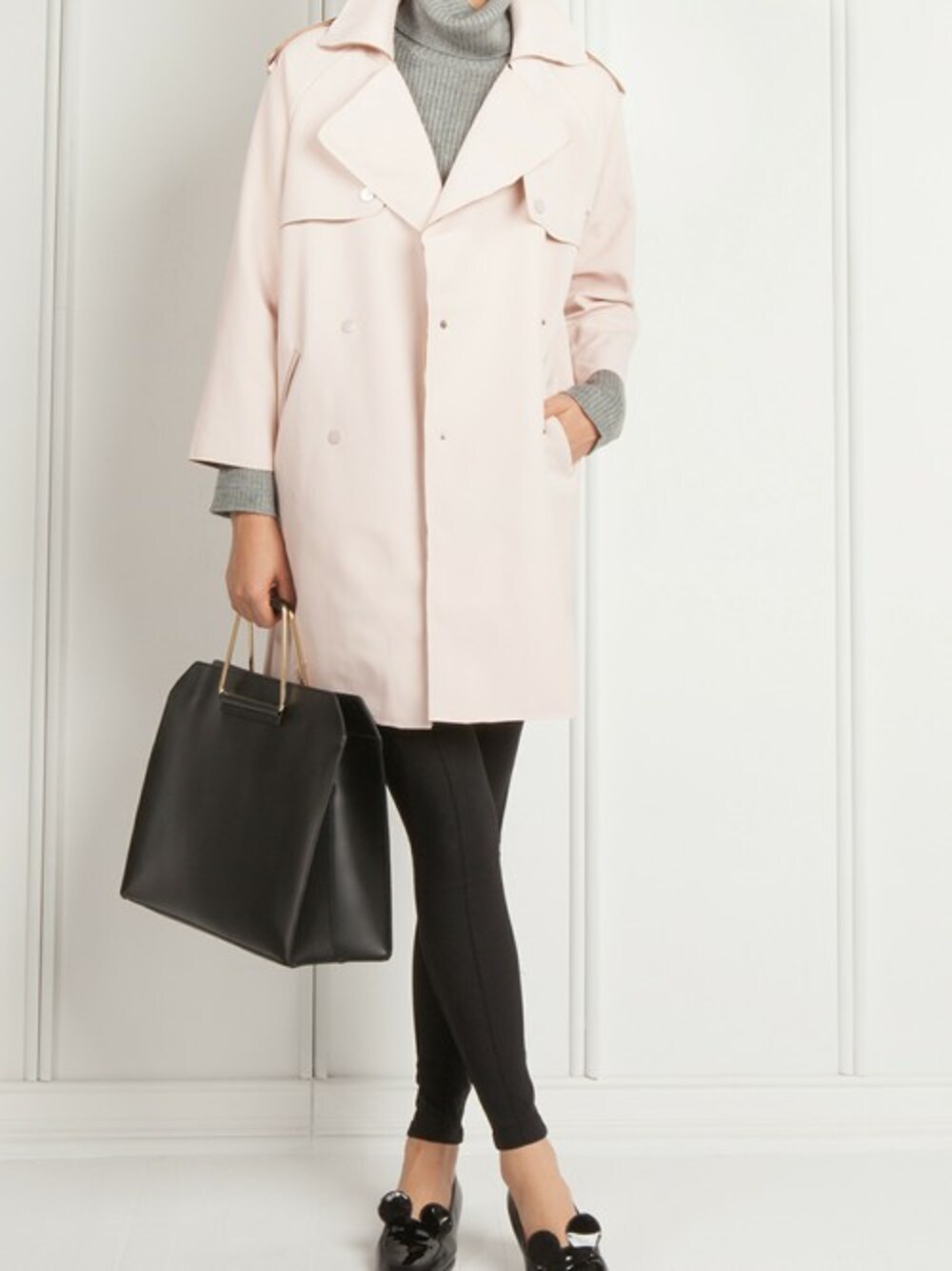 Our classic black trench coat comes with just a hint of color in cobalt blue trimming. Its tough and sturdy material is ideal for mercurial weather and the loose fit is perfect for layering over a turtleneck sweater in colder temperatures. 3/4 sleeves. No belt. Available in Beige/White, Pink/White. 100% Polyester Dry Clean/ Hand Wash Notes: No Belt Loose Fit Trimming details 3/4 Sleeves Model is 173cm/5'8'' and is wearing size S