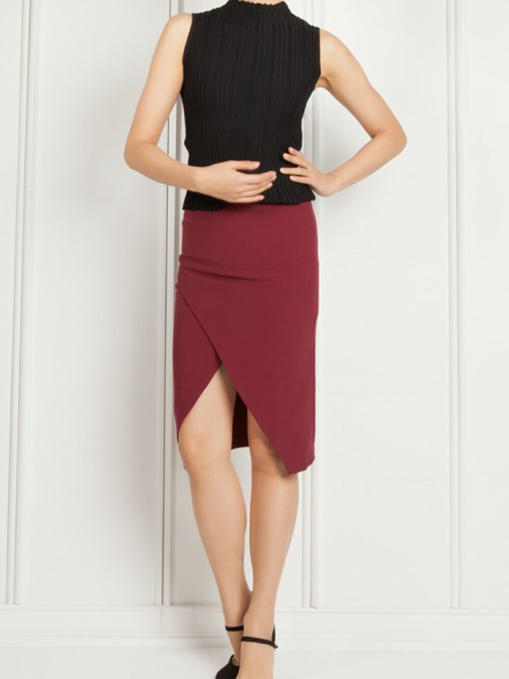 Options are never ending with this soft fabric skirt burgundy pencil skirt with asymmetric hem and a sultry front slit. Pair with black sleeveless top and a fitted jacket with strappy heels for an office friendly look. Wear with a silk top and statement jewelry while sipping a cocktail with friends 40% Cotton 60% Polyester Mild Dry Clean/ Hand Wash Do not Bleach Iron at 110 degrees max Notes: Irregular front slit Soft Material Model is 173 cm/5'8'' and is wearing size S