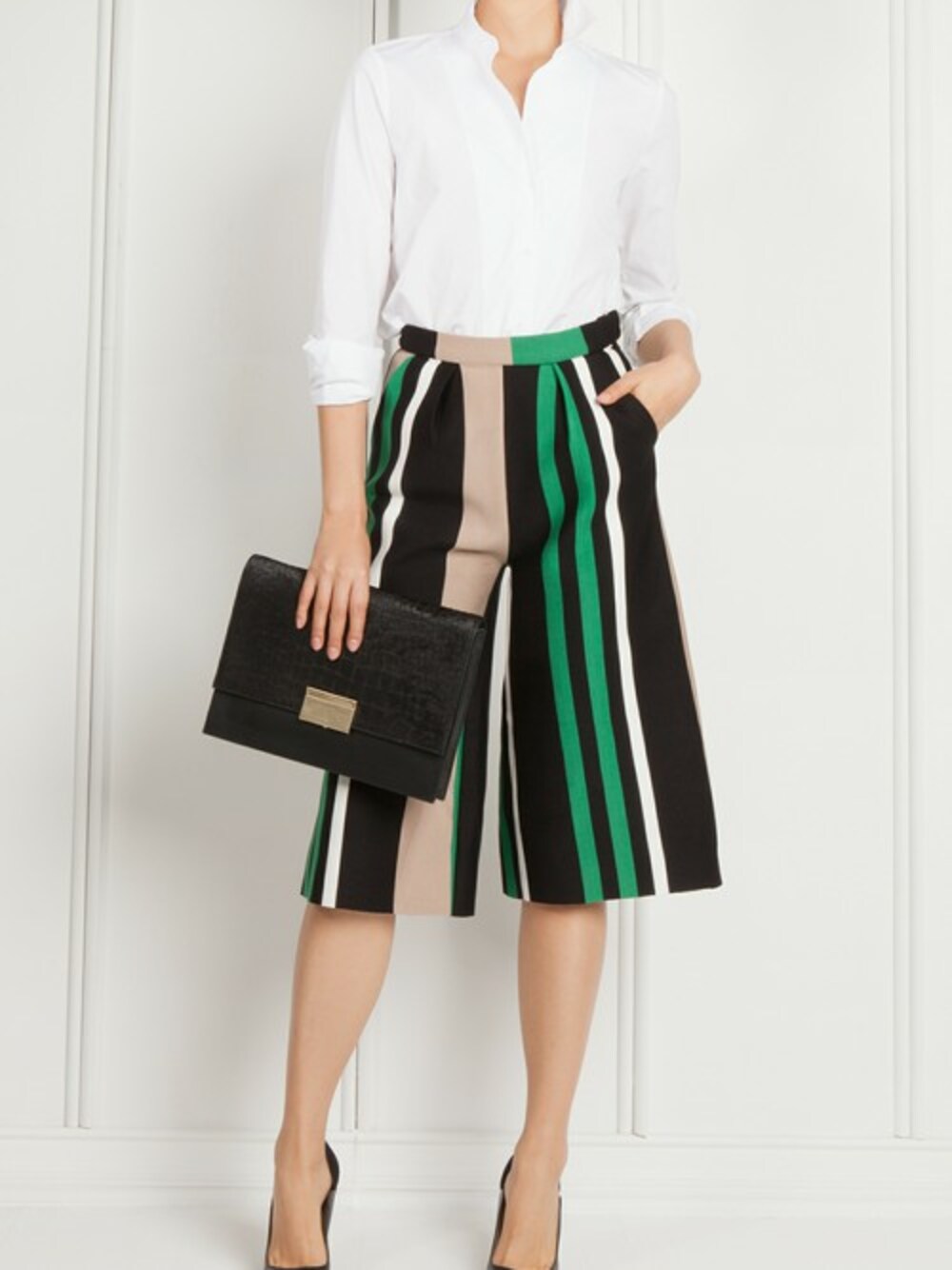 Take candy stripes to the next level in our high waisted culottes striped in green, white, black, and beige. These fun wide legged pants fall just below the knee and have side pockets. Pair with a classic white collared shirt and black patent leather heels for a striking look. Runs small. 100% Polyester Dry Clean Do not Bleach Iron at 110 degrees max Notes: High waist Runs small Model is 173 cm/5'8'' and is wearing size S