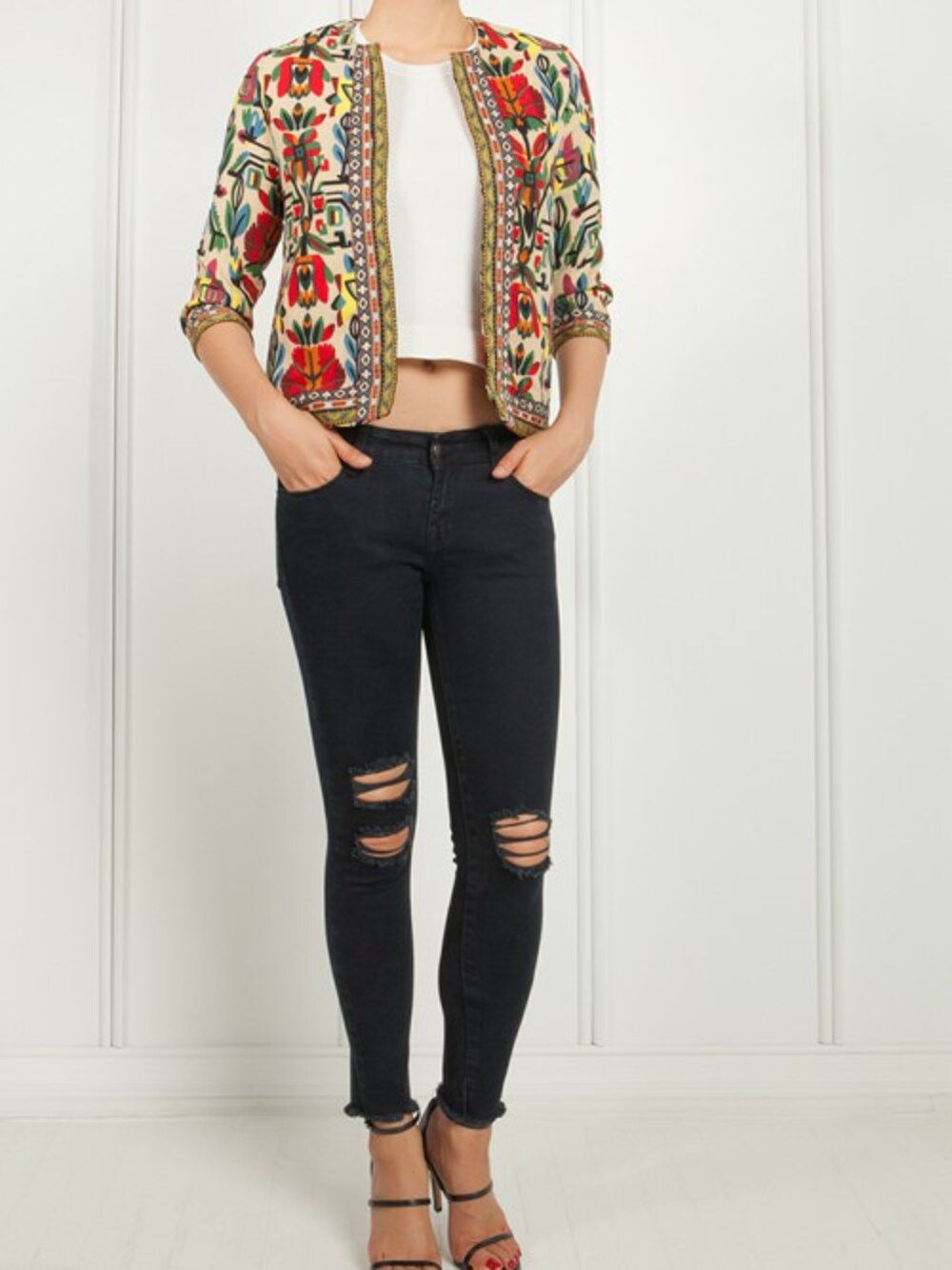 Inspired by your latest museum outing, how about some wearable art? The colorful knit patterns on this cropped jacket make for a bold alternative aesthetic. Art may be subjective but you’ll be undeniably alluring. 100% Polyester Hand wash 30 degree Do not Bleach Hanging dry Notes: 3/4 sleeves Tribal prints Ribbon trimmed hem Model is 173 cm/5'8'' and is wearing size S