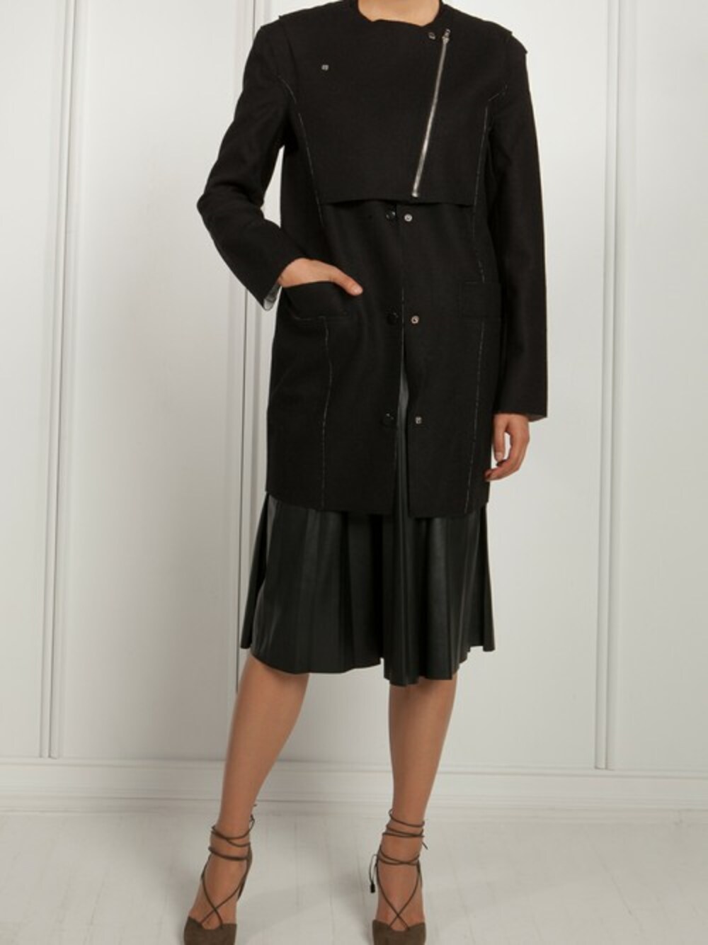 Be it the ever changing weather or your own evolution of style, you’ll always be prepared in our Metamorphosis Military Jacket. Though featuring front snap closure, the multi zipper options and convertible two toned paneling allows you to adjust your look at will, from the more conventional to the avant-garde. The bold look of the deconstructed lining and overall versatility will make you a fashionable force to be reckoned with. 50% Wool, 50% Polyester, lining 95% Polyester, 5% Viscose Mild Dry Clean/ Hand wash Do not Bleach Iron on low heat Notes: Tough Material Multiple zippers and ways of wearing this piece Model is 173 cm/5'8'' and is wearing size S