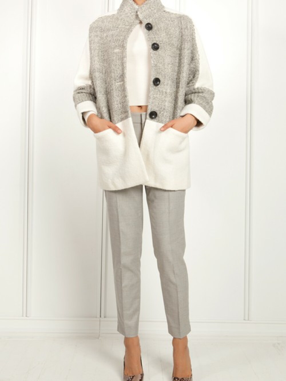 It may be cold but that won’t keep you inside this winter. The white and grey paneling of this textured wool coat adds a polished look for this polar vortex, while the high neck line keeps out the freeze while still looking fierce. Our oversized Cocoon Coat is perfect for a girl on the go.