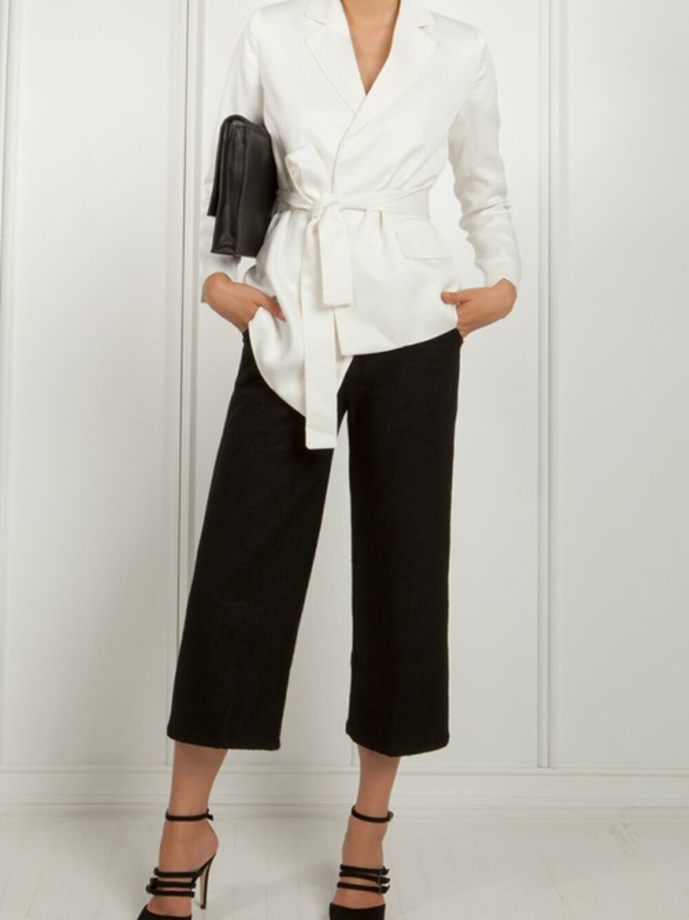 Away on a business trip and unwinding in the hotel bar? Exude confidence in our winter white Jolie wrap blazer. The asymmetrical lines and tied belt allows for an air of professional elegance. Also pairs perfectly with a well earned martini. 20% Silk, 80% Polyester Mild Dry Clean Do not Bleach Low iron Notes: Textured material With belt Model is 173 cm/5'8'' and is wearing size S